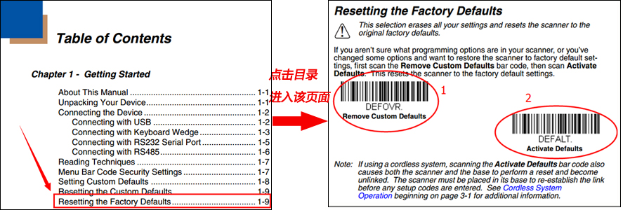 一般恢復(fù)出廠設(shè)置的介紹在第一章節(jié),如上圖,我們在目錄中就可以很明顯的找到【Resetting the Factory Defaults】,點擊進入該頁面,依次掃描這兩個條碼即可。